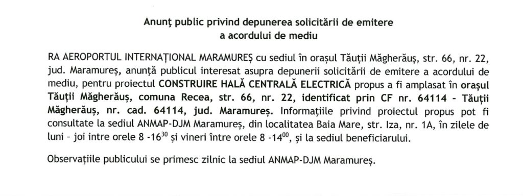 Anunț public privind depunerea solicitării de emitere a acordului de mediu